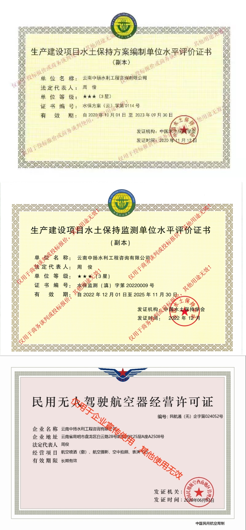 云南中揚(yáng)水利工程咨詢有限公司成立于2011年,注冊(cè)資金100萬元整。公司從事的主要業(yè)務(wù)為生產(chǎn)建設(shè)項(xiàng)目水土保持咨詢?cè)O(shè)計(jì)(水保方案編制、水保監(jiān)測(cè)、技術(shù)評(píng)估及咨詢)、水土保持規(guī)劃、水利工程設(shè)計(jì)(農(nóng)田水利、河道)、可行性研究報(bào)告編制、土地復(fù)墾等。公司已取得水土保持方案編制、水土保持監(jiān)測(cè)、工程咨詢備案、環(huán)境污染治理、環(huán)境保護(hù)行業(yè)技術(shù)咨詢服務(wù)能力評(píng)價(jià)證書、民用無人駕駛航空器經(jīng)營(yíng)許可證等資格證書,是云南省水土保持學(xué)會(huì)和云南省環(huán)境保護(hù)協(xié)會(huì)會(huì)員。