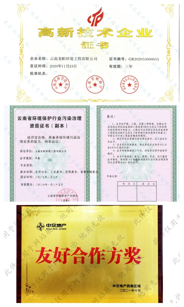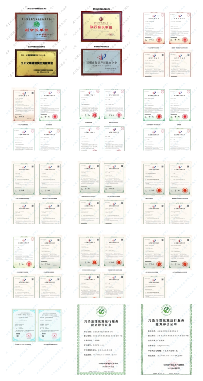 公司持有環(huán)保工程專業(yè)承包二級、市政公用工程總承包三級、建筑工程總承包三級、污染治理乙級、污染治理設施運行服務二級資質(zhì)證書。前后獲得“十二五”生態(tài)文明建設突出貢獻單位、云南省省級成長型中小企業(yè)、云南省知識產(chǎn)權優(yōu)勢企業(yè)、云南省科技型中小企業(yè)、云南省專精特新中小企業(yè)、招商蛇口最佳合作伙伴、中交置業(yè)友好合作方獎等榮譽。